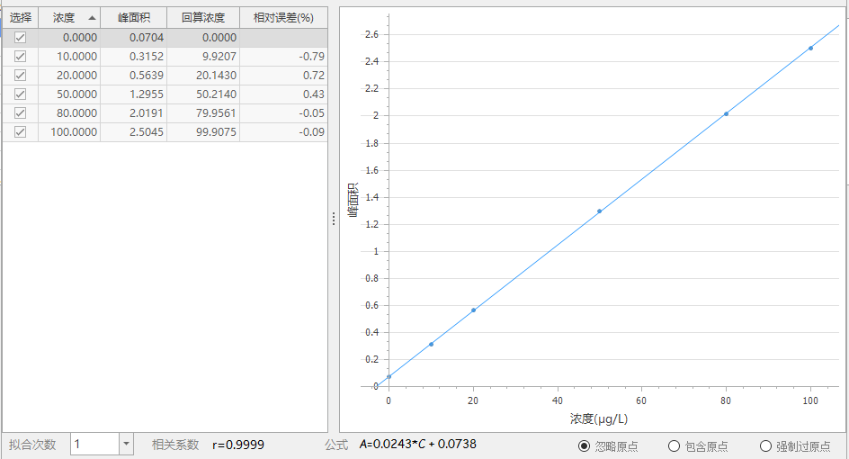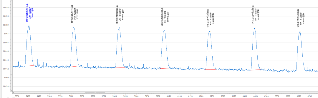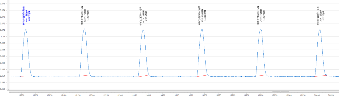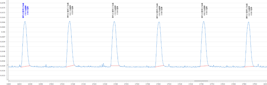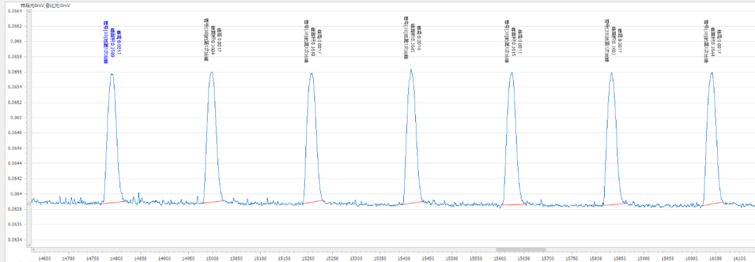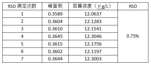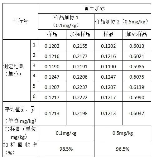 表1 实验所用标准溶液/试剂蒸馏试剂(R1)、铁氰化钾缓冲液(R2)、4-氨基安替比林显色剂(R3)、载流(C)。标准工作液(10、20、50、80、100μg/L):分别准确移取0.1mL、0.2mL、0.5mL、0.8mL、1mL挥发酚标准中间液(1000μg/L)于10 mL容量瓶中,用超纯水定容至刻度,混匀,配制成 10-100μg/L 的标准系列工作液。将挥发酚标准系列工作液(10μg/L、20μg/L、50μg/L、80μg/L 和 100μg/L)分别进样,以浓度为横坐标,峰面积为纵坐标绘制标准曲线,挥发酚的线性在0.9999以上,标准曲线见图1。按照《HJ998-2018 土壤和沉积物挥发酚的测定4-氨基安替比林分光光度法》进行试样的提取,定量重复性(峰面积)测定结果见表2,重复性的分析峰形图见图2。将5μg/L挥发酚溶液连续测定7次,当n=7时t=3.14,检出限(5μg/L):0.63μg/L,结果详见表3,分析峰形图见图3。按照《HJ998-2018 土壤和沉积物挥发酚的测定4-氨基安替比林分光光度法》对石英砂、石英砂加标、黄土、和黄土加标进行试样的提取,将样品提取液连续测定6次,得到加标回收率。加标回收率测定结果见表4,加标回收率的分析峰形图见图4-5。本文所述的土壤中挥发酚分析方法,是使用聚光科技子公司北京吉天仪器有限公司的iFIA7全自动多参数流动注射分析仪测定,以氢氧化钠为提取液对待测物进行浸提,提取液直接上机进行分析,此方法测试线性相关系数为0.9999;定量重复性为0.75%;加标回收率为93.9%-98.5%。经计算此方法可满足《HJ998-2018 土壤和沉积物挥发酚的测定4-氨基安替比林分光光度法》的检测需求。