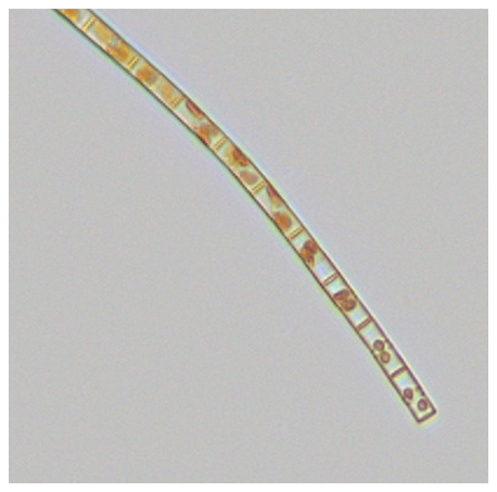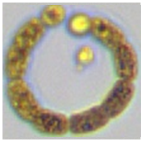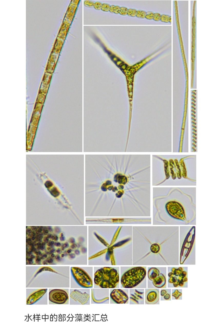 随着气温升高,藻类生长进入快速期,对浙江某湖区进行实地考察,发现湖区某处因风向和水动力等诸多因素出现了藻类聚集,水体颜色加深。使用定量采样瓶采样,然后马上回实验室上机检测发现水体藻密度达到108cells/L量级,其中优势最大藻种为假鱼腥藻占比超过60%,水体较多的还有项圈藻、实球藻、直链藻、针杆藻等。下面是检测到藻类的部分图例和检测数据。
