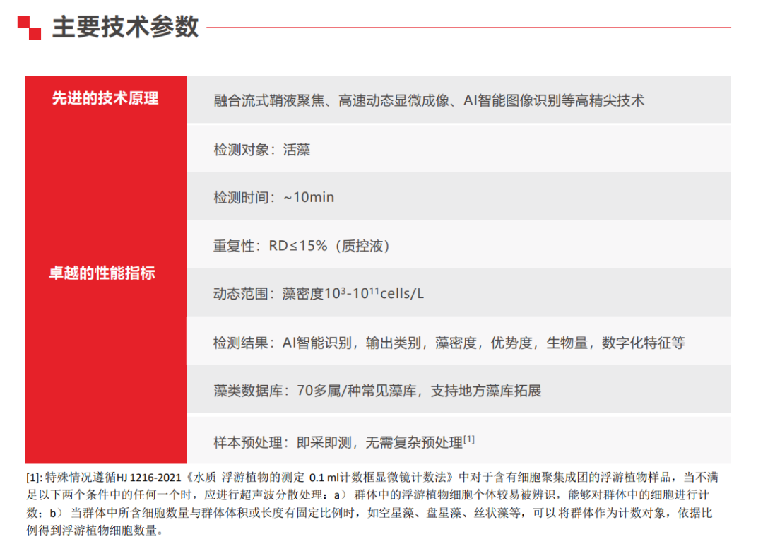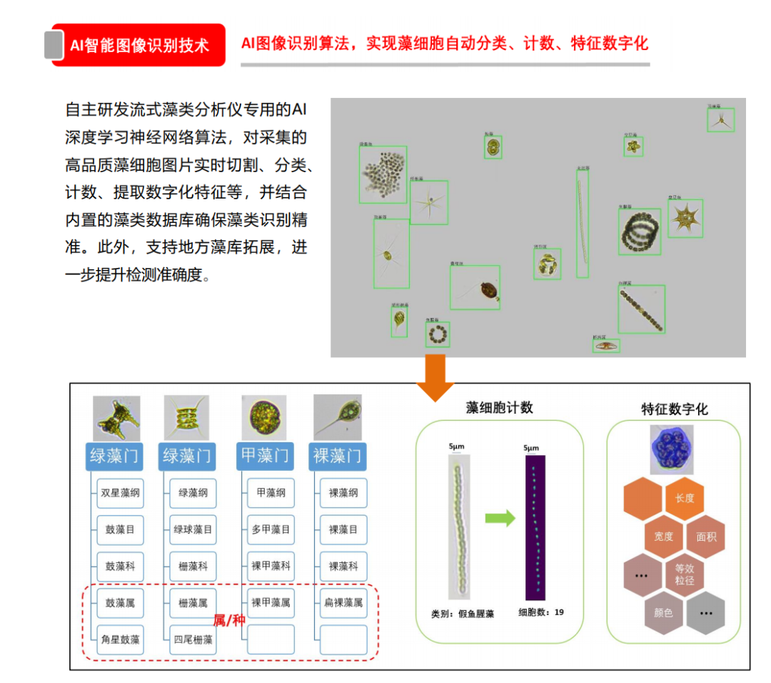 湖北某生态环保局管理的库区河道回水区存在大面积蓝藻爆发,由于蓝藻水华不仅会对水体水质和生态系统产生严重影响,且浮游植物生长周期短,变化快,要求藻类检测设备能高效快速浮游植物密度及其种群结构的变化情况,加强对浮游植物组成的动态监测,以便采取及时有效的防控措施。