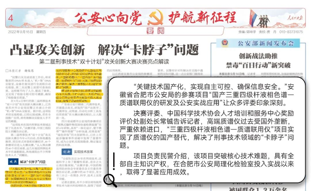 由合肥市公安局和谱育科技等单位共同完成的国产三重四极杆液相色谱—质谱联用仪研发及公安实战应用”获得大赛金奖。
