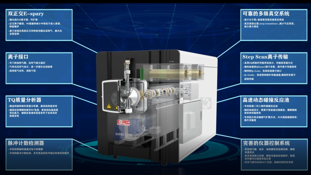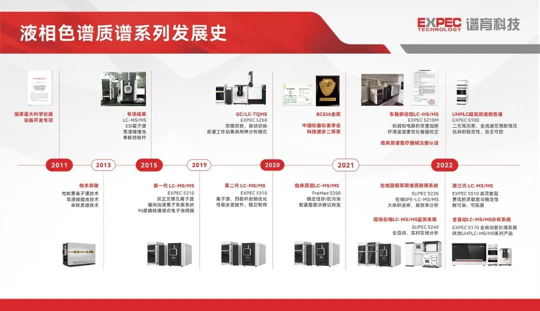 自2011年以来,谱育科技自主研制了EXPEC 5200系列 三重四极质谱联用仪,推出了EXPEC 5510/EXPEC 5310/EXPEC 5210等实验室分析,SUPEC 5220/SUPEC 5240在线分析,EXPEC 5210M车载移动分析、SUPEC 5170 自动化分析等技术领先的产品组合,促进了复杂基质中痕量有机污染物检测能力全面提升。