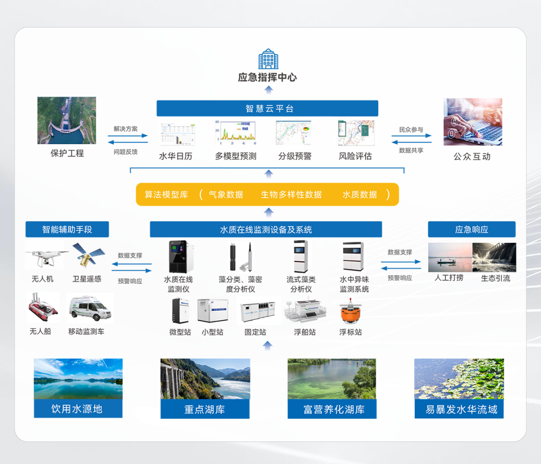 预测预警:通过多源模型动态模拟和立体剖析,预测藻类和叶绿素a浓度变化并进行预警,为水华防控预留准备时间;