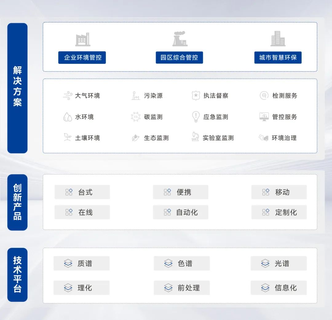 聚光科技大气环境监测板块由常规环境空气监测、大气臭氧及光化学污染源解析监测、碳监测、大气颗粒物污染源解析监测和噪声在线自动监测等核心模块组成,搭建大气环境监管“天地空一体化监测网络”,实现对大气环境中污染因子全面、连续、准确、真实的自动监测,对区域性大气污染精准治理和空气质量精细化管理以及重污染应急、治理成效评估提供长期基础数据和技术支持。