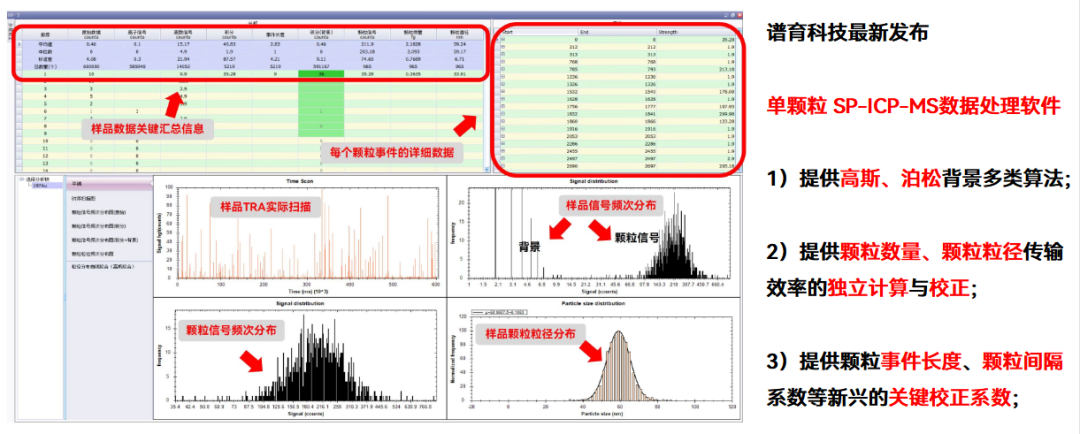 谱育科技作为国内高端科学仪器领军企业之一,在单颗粒-ICP-MS方面,进行了大量的基础研究与前沿应用的工作。如研发了单颗粒-ICP-MS专用的数据处理软件,其中包含分析方法设置、单颗粒核心数据处理技术(背景阈值算法、颗粒事件识别的多重算法、颗粒信号整合、传输效率计算等)、单颗粒数据解析(溶解态离子浓度解析、颗粒数量浓度解析、颗粒粒径分布解析)等多重核心功能。在环境、生物、半导体、微塑料、单颗粒等前沿领域也开展了大量研究。