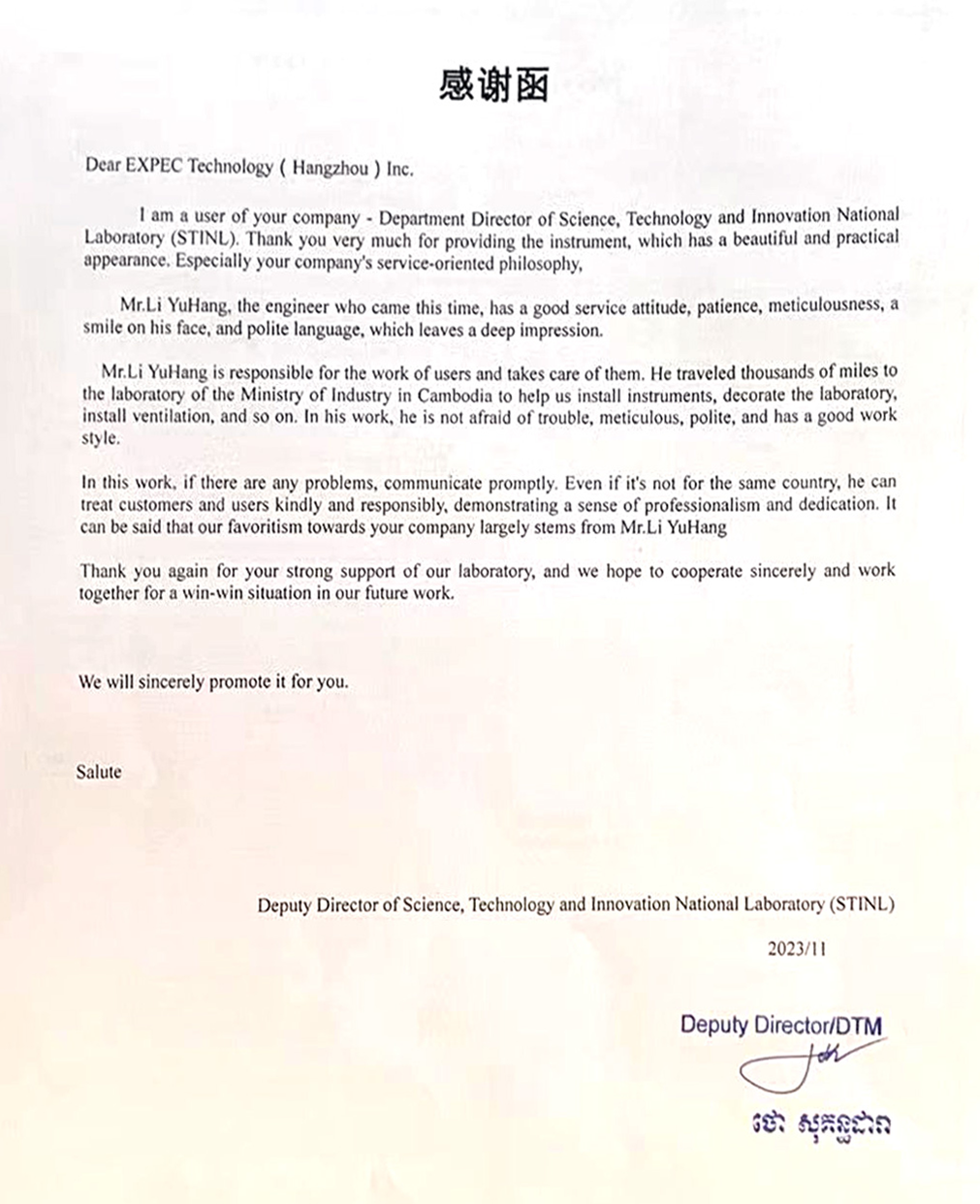今年11月,谱育科技完成了“中柬食品工业联合实验室”ICP-OES、离子色谱、分光光度计、离心机等12套设备的仪器安装、调试及技术培训,帮助柬埔寨实验室人员完成样品测试。为此,柬埔寨科技创新实验室发来一份感谢信,对谱育科技产品、技术服务表示肯定。