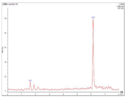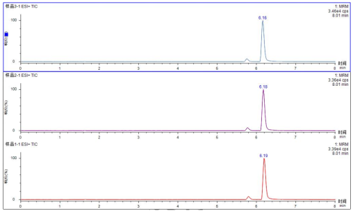 取马兜铃中药材,粉碎机粉碎,50目过筛两次,精密称取0.2g,加70%甲醇20mL,超声提取40 min,冷却至室温,用70%甲醇定容至25mL,精密吸取该溶液1mL,用50%甲醇稀释并定容至25mL,精密吸取该溶液1mL,用50%甲醇稀释并定容至 100mL,过 0.22μm 滤膜后,上机测定。LC条件:流动相A,1mM甲酸铵-0.05%甲酸水溶液;流动相B,甲醇;流速,0.3mL/min;色谱柱,BEH C18(2.1x100mm,1.7μm );进样量 10μL;梯度,流动相A,0-2min, 45%;6min, 20%;6.1-8min,45%。MS条件:运行模式ESI+,毛细管高压 4 kV,去溶剂气流量 10.0 L/min,反吹气流量 0.8 L/min,去溶剂气温度 380 ℃,碰撞气流量 0.45 mL/min,雾化气流量 1.2 L/min。配置 0.1 μg/L 浓度标准溶液进样,按照 S/N=10 和 S/N=3 计算定量限和检出限,马兜铃酸检测限为 0.0044 μg/L,定量限为 0.0149 μg/L。图1为0.1 μg/L 马兜铃酸A的色谱图。选择3个不同浓度的马兜铃酸A标准品,连续 6 针进样,考察方法稳定性,结果见表1。在中药马兜铃样品加标浓度分别为 1 μg/L、10 μg/L、50 μg/L,每个浓度平行测定 3 次,回收率测定结果分别为 86.7%,87.8% 和 98.2%。本文使用聚光科技自主孵化子公司谱育科技的EXPEC 5210 LC-MS/MS建立了检测中药马兜铃中的马兜铃酸A的方法,方法检测速度快、灵敏度高、稳定性好,准确可靠,可用于进行中药中马兜铃酸A的检测。