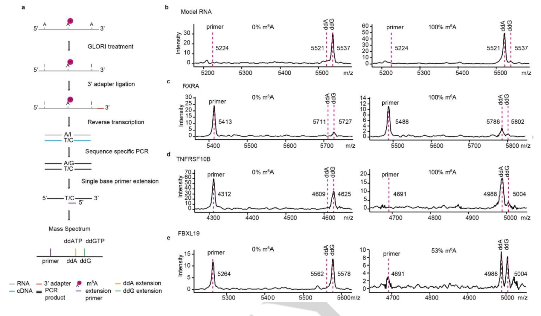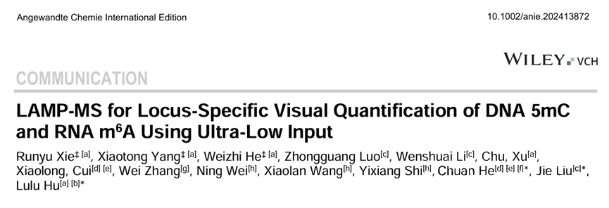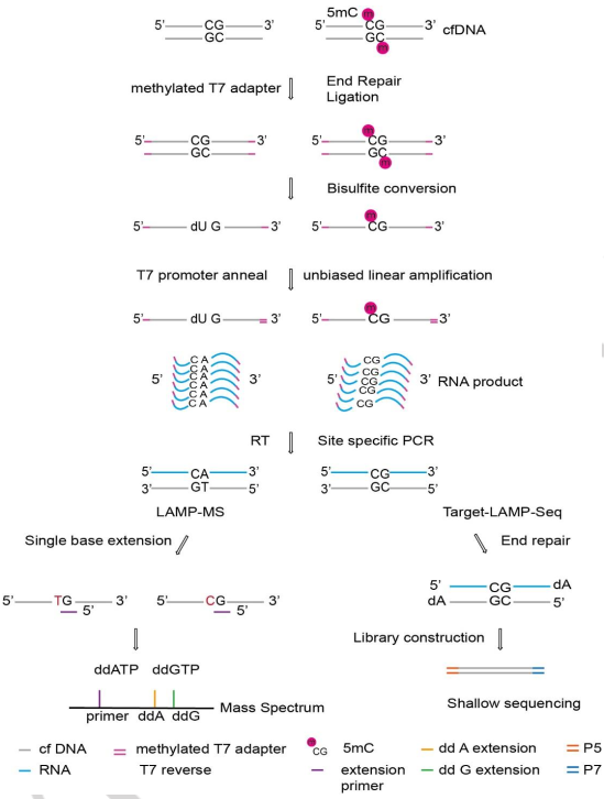 2024年11月4日,国际化学类顶级期刊《德国应用化学国际版》(Angewandte Chemie-international Edition)(IF 16.1)上发表了题为《LAMP-MS for Locus-Specific Visual Quantification of DNA 5mC and RNA m6A Using Ultra-Low Input》的研究论文。报道了一种基于核酸质谱平台的创新甲基化检测方法,该工作由复旦大学医学院胡璐璐研究员团队、华山医院消化科刘杰主任团队、美国芝加哥大学何川院士团队携手柏锘(上海)医疗科技有限公司共同完成。 该研究中所使用的飞行时间质谱平台为聚光科技生命科学板块旗下聚致生物(GenWish)自主研发的GeneTOF 3100核酸质谱分析系统。 液体活检技术通过收集血液中来自各种组织的游离DNA(cfDNA),对其中包含的生物标志物(如基因突变、甲基化或羟甲基等表观修饰)进行检测,具有无创、高效的特点。与传统的各种检测技术(例如胃肠镜、血清标志物)相比,液体活检在临床上具有革命性的优势,在癌症等疾病的早筛早诊、预后监测、疗效评估等诸多方面有广阔的应用前景。 DNA甲基化作为一种重要的表观遗传修饰,可在肿瘤发生的早期被检测到,且具有较好的稳定性,因此成为肿瘤液体活检中一个极具价值的生物标志物。但是,目前基于亚硫酸氢盐测序技术的甲基化检测方法,很难避免DNA的降解;且高通量测序成本较高,实验后的分析工作复杂;PCR检测涵盖的位点也有限,因此开发一种经济、可靠、通量灵活且能够覆盖多位点的新甲基化检测方法,是非常具有意义的。 研究团队开发的LAMP-MS方法创造性地将线性扩增和飞行时间质谱技术结合在一起,只需要1ng血浆cfDNA,通过多重PCR和单碱基引物延伸,能够在较短时间内同时检测数十个甲基化位点。该技术主要操作步骤如图1所示: LAMP-MS的完整工作流程