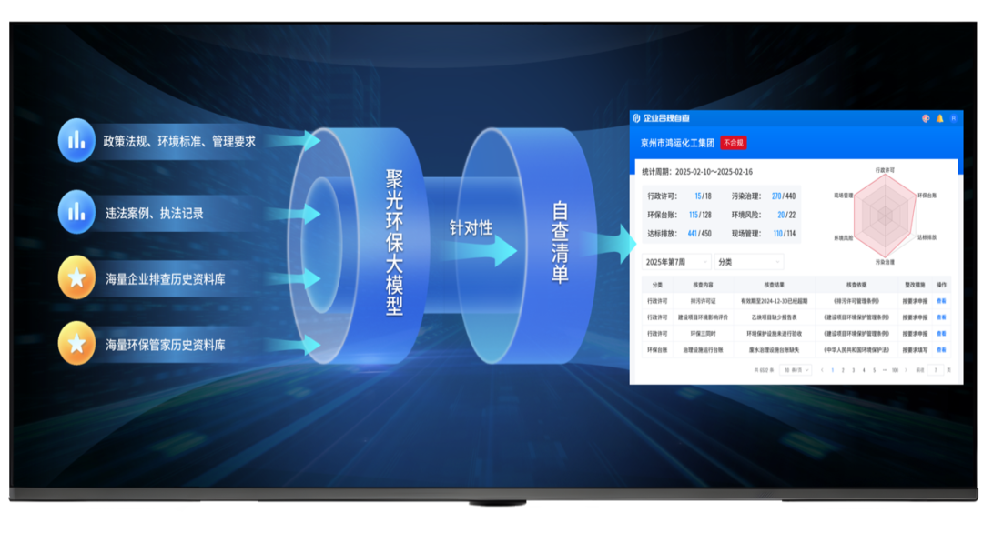 智能自查:环保大模型自动解析最新政策法规,生成自查清单,实现任务下发-跟踪-闭环全流程线上管理。