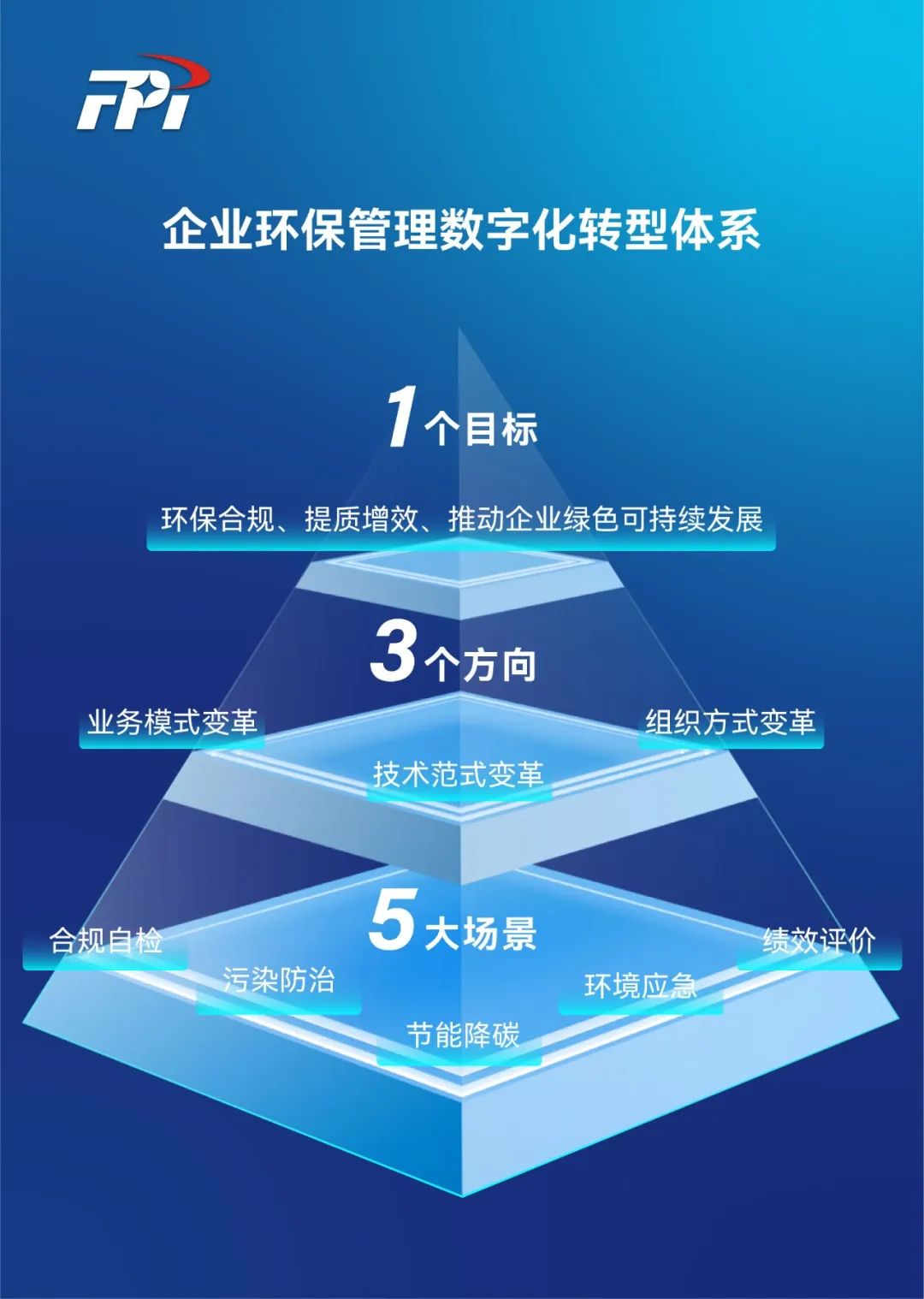 聚光科技在企业数字化转型框架下,打造“一个目标、三个方向、五大场景”的环保管理数字化转型金字塔体系。