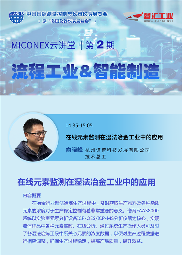 聚光科技旗下子公司杭州谱育科技发展有限公司(以下简称:谱育科技)技术总工俞晓峰和解决方案团队应邀参加MICONEX云讲堂第2期《流程工业&智能智造》,将围绕《在线元素监测在湿法冶金工业中的应用》开展主题报告,在线帮助流程行业解决“数据实时性差、样品代表性差”等难题,实现“生产工艺优化,产品品质提升”,满满干货。